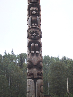 | In this area, the indigenous people traditionally made totem poles which were raised at special events and carved with images relating to the history of the family who erected it. In some villages we passed through totems are still raised on special occasions. |