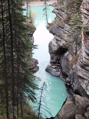 | A different shade of turquoise in a river gorge close to Athabasca Falls. |