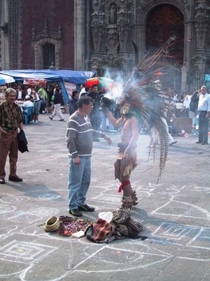 | The Zocalo, the main square in Mexico City is a focus of activity for street performers. Here rhythmical Aztec dances are being performed to the sound of drums and the rattles of a kind of leg warmer made of shells. |