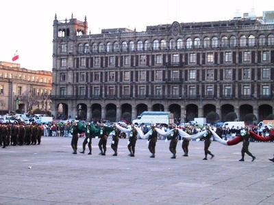 | There is a ceremony every evening just before sunset when the giant Mexican flag, which flies over the Zocalo, is lowered, folded and carried into the National Palace for the night. |