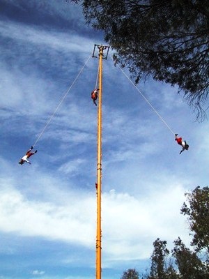 | Volodores perform an ancient religious rite which involves five men climbing to the top of a pole to a square wooden frame. Four of them attach themselves to ropes and launch backwards, revolving slowly around the pole and gradually descending as the rope unwinds to an eerie whistle and drumbeat played by the fifth man. |