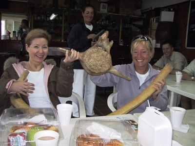 | Bit too close! Although they are twice the size of the boat they were careful to avoid hitting us. Didn't need those binoculars after all. |