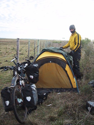 | As the wind was slowing us down, the last week involved very long days with short breaks for meals at the side of the road. We resolved never to stop pedalling until our Speedos showed at least 80 miles for the day. On very windy days we put in 12 hours of cycling. |