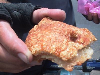 | Jeremy was surprised to discover a pigs nipple on his pork crackling! It tasted good. |